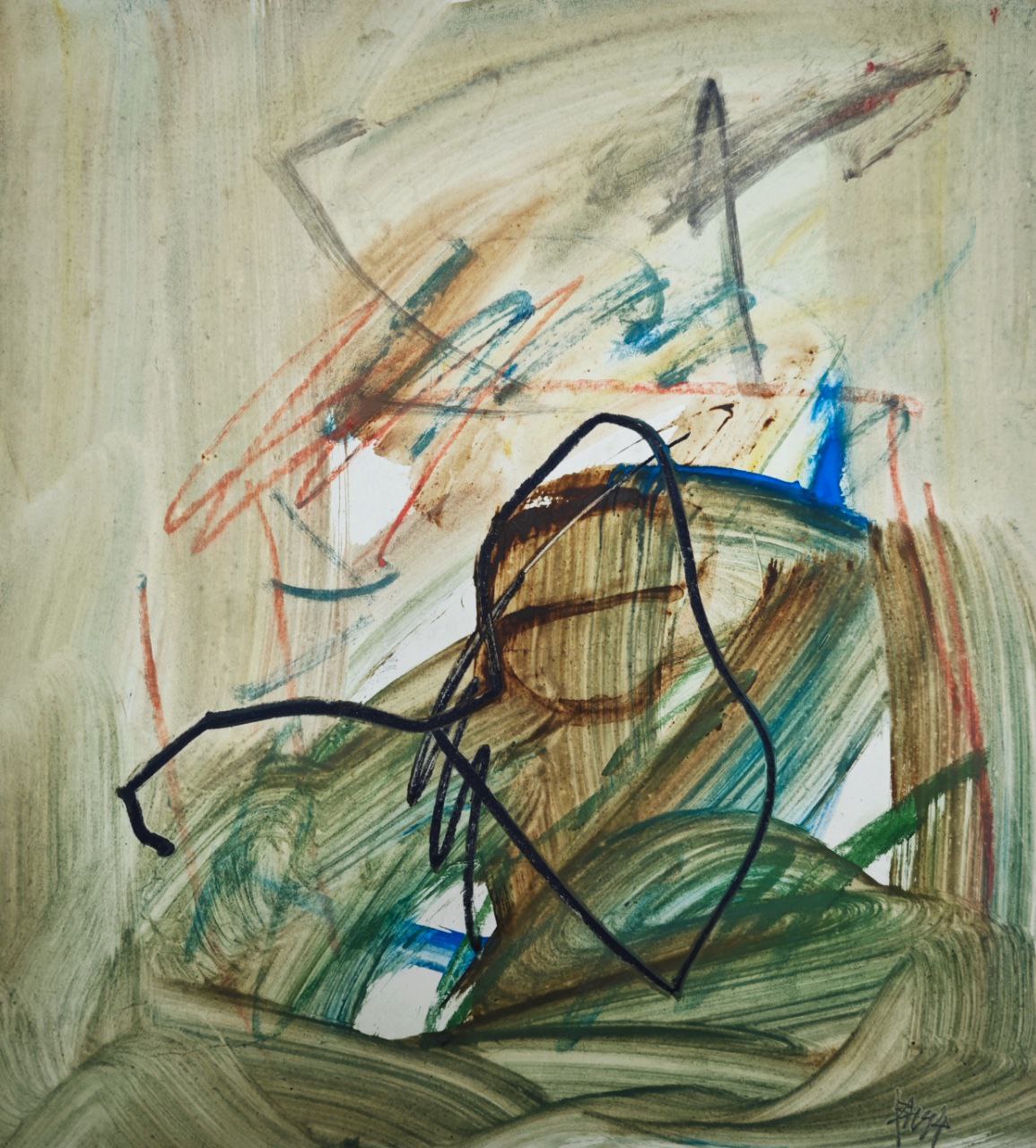 Без названия абстрактная каллиграфия бумага, акрил оформлена в раму, стекло, паспарту Размер: 30 х 41,7 см Размер в раме: 44 х 55,7 см 1988 г. В правом нижнем углу авторская подпись монограммой и дата: ВН88 Провенанс: частная коллекция, Москва